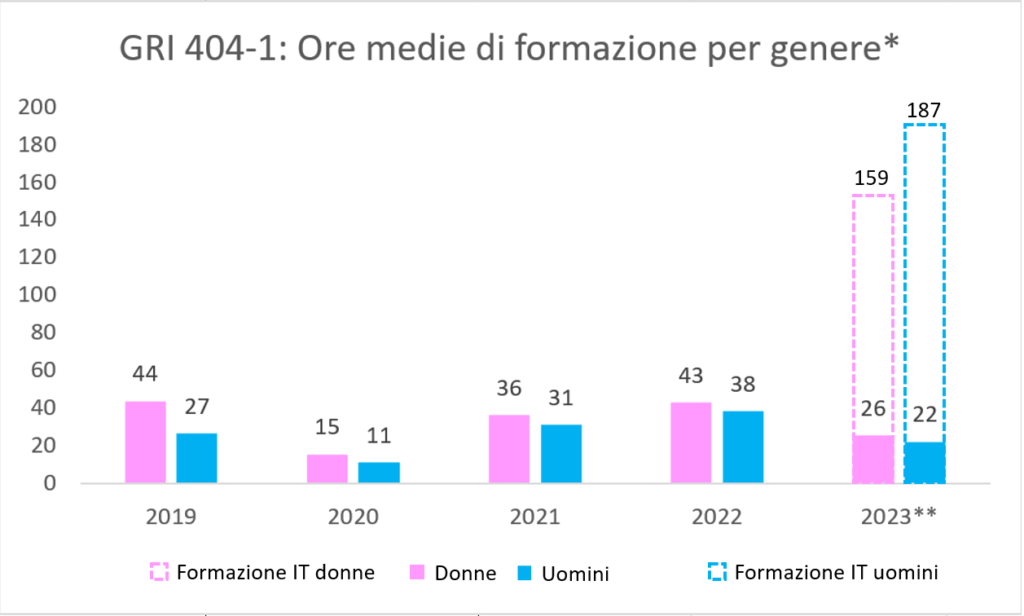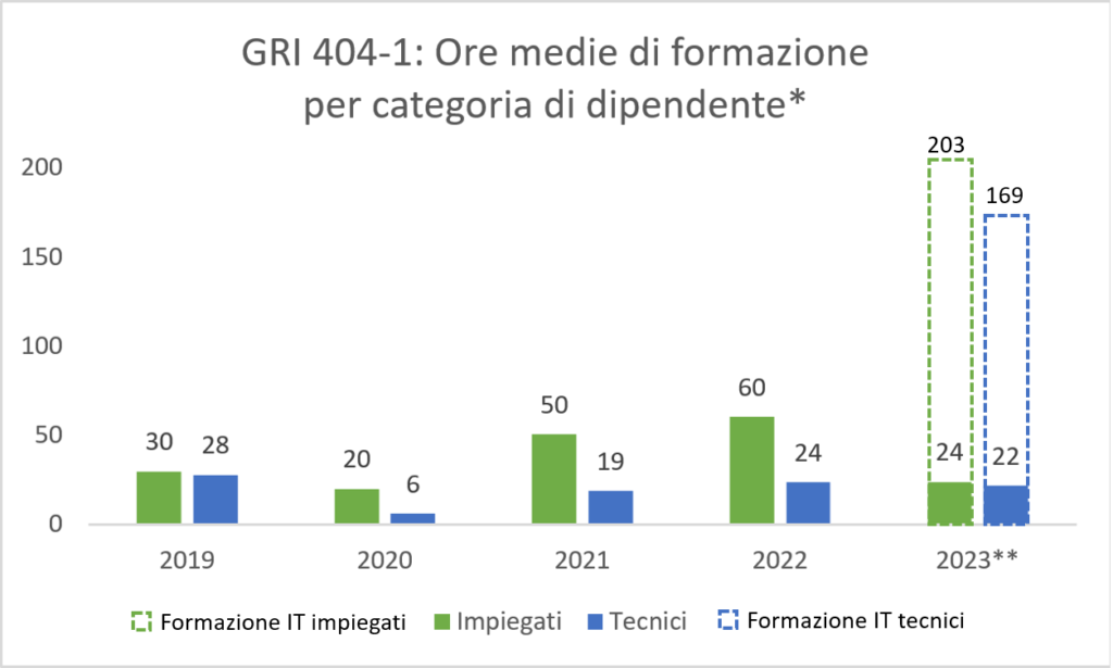** Per l’anno 2023 le ore totali comprendenti le ore di formazione IT vengono rappresentate dalle aree tratteggiate